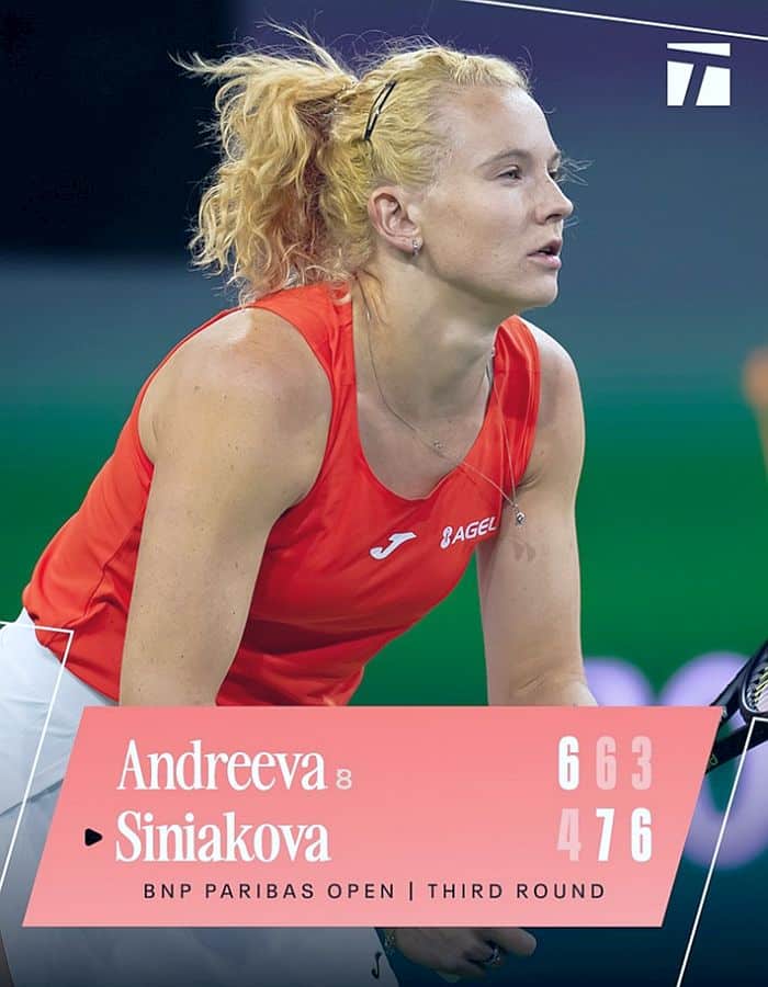 ● 4/3 – 15/3 BNP Parisbas Open, Indian Wells, USA (ATP/WTA 1000): Den forblæste ørken-by bød på flere tennis-dramaer. Gabriela Ruse tabte i første runde til Ajla Tomljanovic og Tereza Valentová knebent til Donna Vekic. I en spændende kamp måtte Vekic derefter se sig slået af Jessica Pegula. Sorana Cîrstea gik videre fra første runde med en 6-4, 4-6, 6-3 sejr over Tatjana Maria og i anden runde 6-2, 7-6 over Diana Sjnaider, men i den spændende tredje runde kamp tabte Cîrstea til Linda Nosková 7-6, 4-6, 4-6, jf. t-majors, som i kvartfinalen besejrede den australske sensation, verdens nr. 112, Talia Gibson, der havde slået Clara Tauson ud; Nosková nåede semifinalerne, men tabte her til Aryna Sabalenka. Jaqueline Cristian vandt også i første runde, slog i anden runde det australske håb Maya Joint, og tabte ligesom Cîrstea i tredje runde – nemlig til verdensetteren Aryna Sabalenka. Dobbelt-stjernen Elise Mertens sendte det spanske håb Cristina Bucsa ud, men tabte til Belinda Bencic. Den anden dobbelt-stjerne Katerina Siniaková vendte et truende nederlag til sejr over Sofia Kenin og vandt desuden over Leylah Fernandez, men sensationen og Mirra Andrejeva ventede: Med utrolig udholdenhed og flotte slag vandt tjekken 4-6, 7-6, 6-3 over favoritten og sidste års vinder, der både smed og smadrede en ketcher undervejs – en maratondyst, der trak søm ud, så mange ‘søm’, at Siniaková måtte trække sig med en skade ved stillingen 1-6, 1-1 i sin næste kamp mod Jelina Svitolina. Jelena Rybakina var ikke sit suveræne jeg, men vandt dog over Hayley Baptiste, Marta Kostjuk, Sonay Karel, Jessica Pegula (kvartfinale) og Jelina Svitolina (semifinale). Det betød endnu en finale mellem Rybakina og Sabalenka, jf. t-gazette, denne gang med Sabalenka som vinder. Den spændende kamp sluttede med en tie-break, og det var Sabalenkas første sejr i Indian Wells: 3-6, 6-3, 7-6. Efter kampen var Sabalenka var fuld af sympati for modstanderen, mens Rybakina var usædvanlig bevæget.